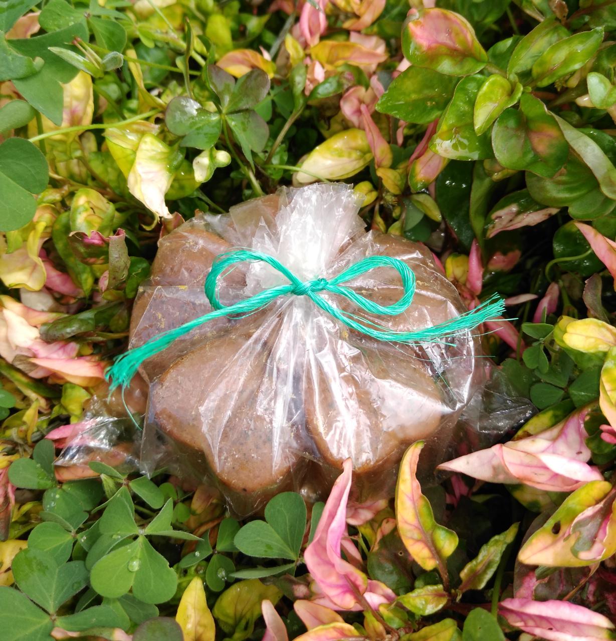 Per l'avvolgimento secondario, le foglie vengono raccolte, pulite e viene applicato uno strato di oli naturali, vedrai il tuo sapone avvolto in base al suo contenuto ... Naturale ed Ecologico! Puoi lanciarlo nel tuo giardino, nel prato o metterlo come il compost sono le tue piante!